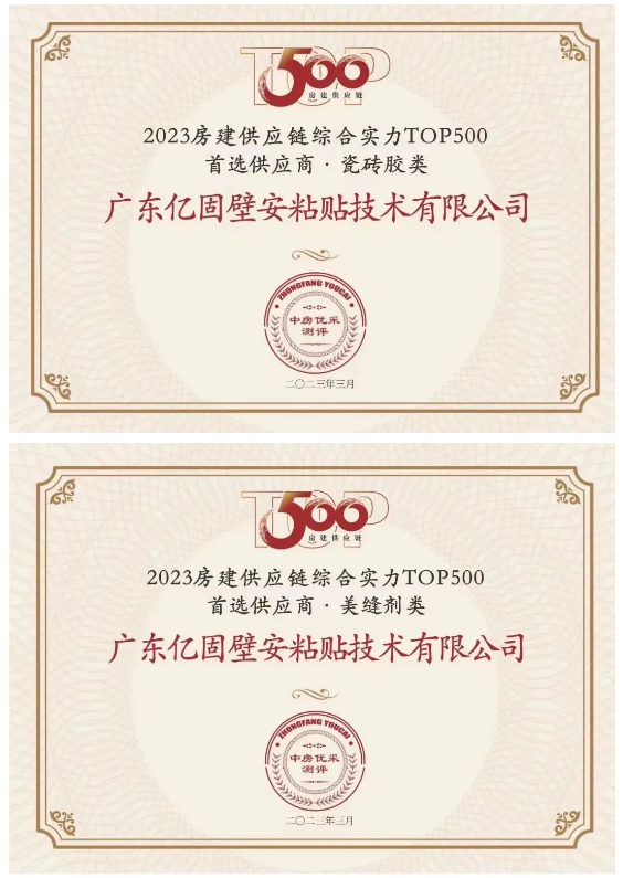 據(jù)悉,這是億固公司連續(xù)第4年榮登“中國房地產(chǎn)開發(fā)企業(yè)500強首選瓷磚膠類品牌”榜單。